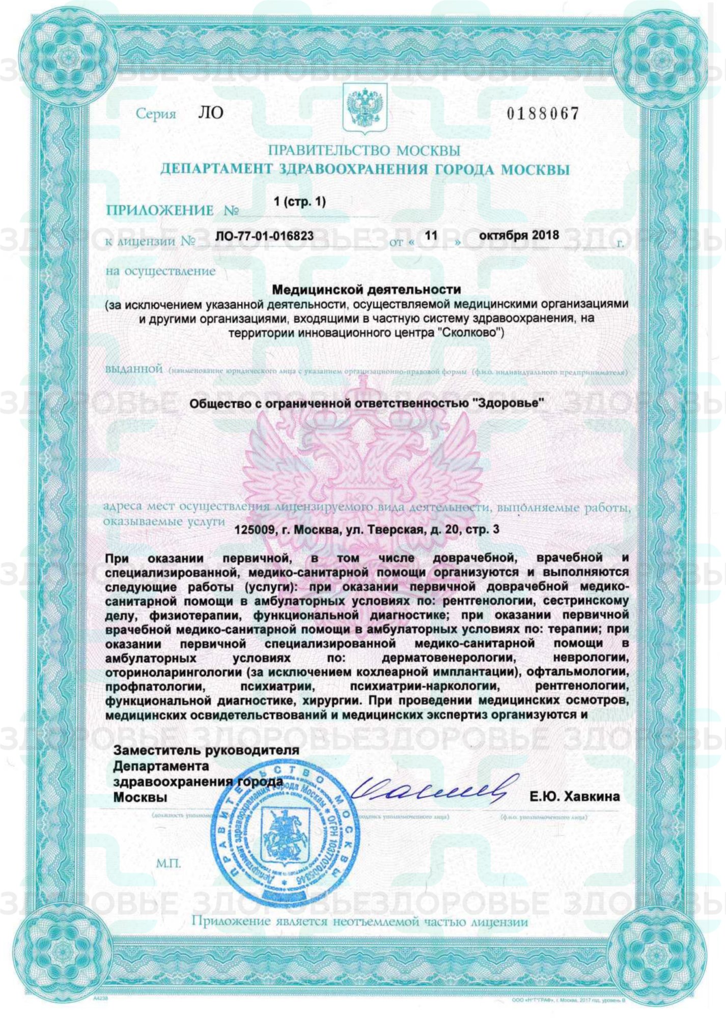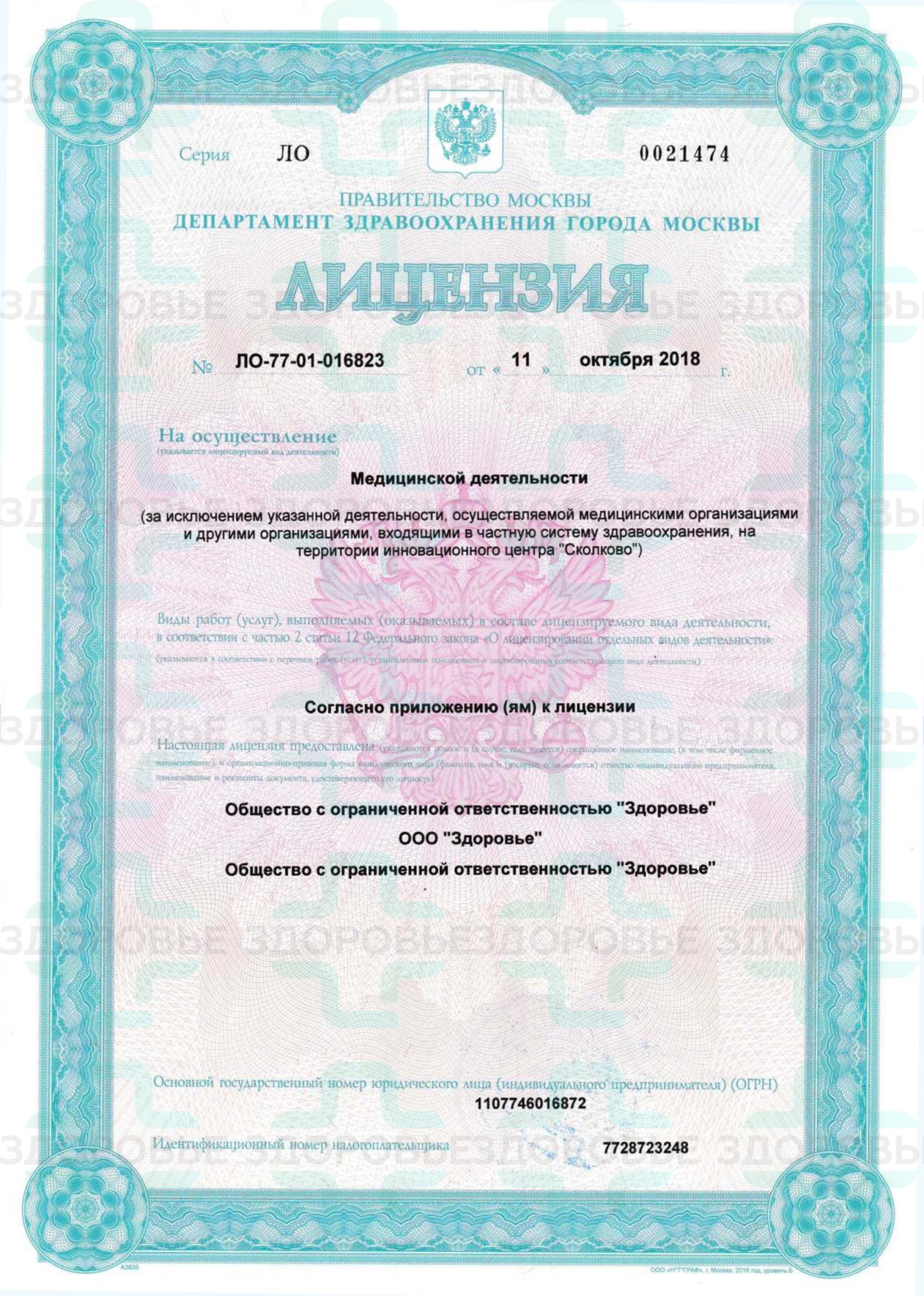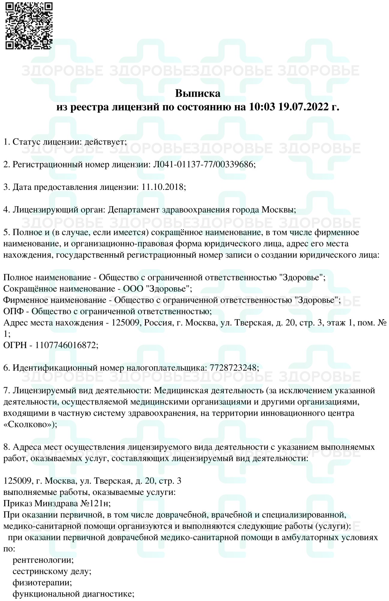 Государственная лицензия клиники Здоровье в Москве