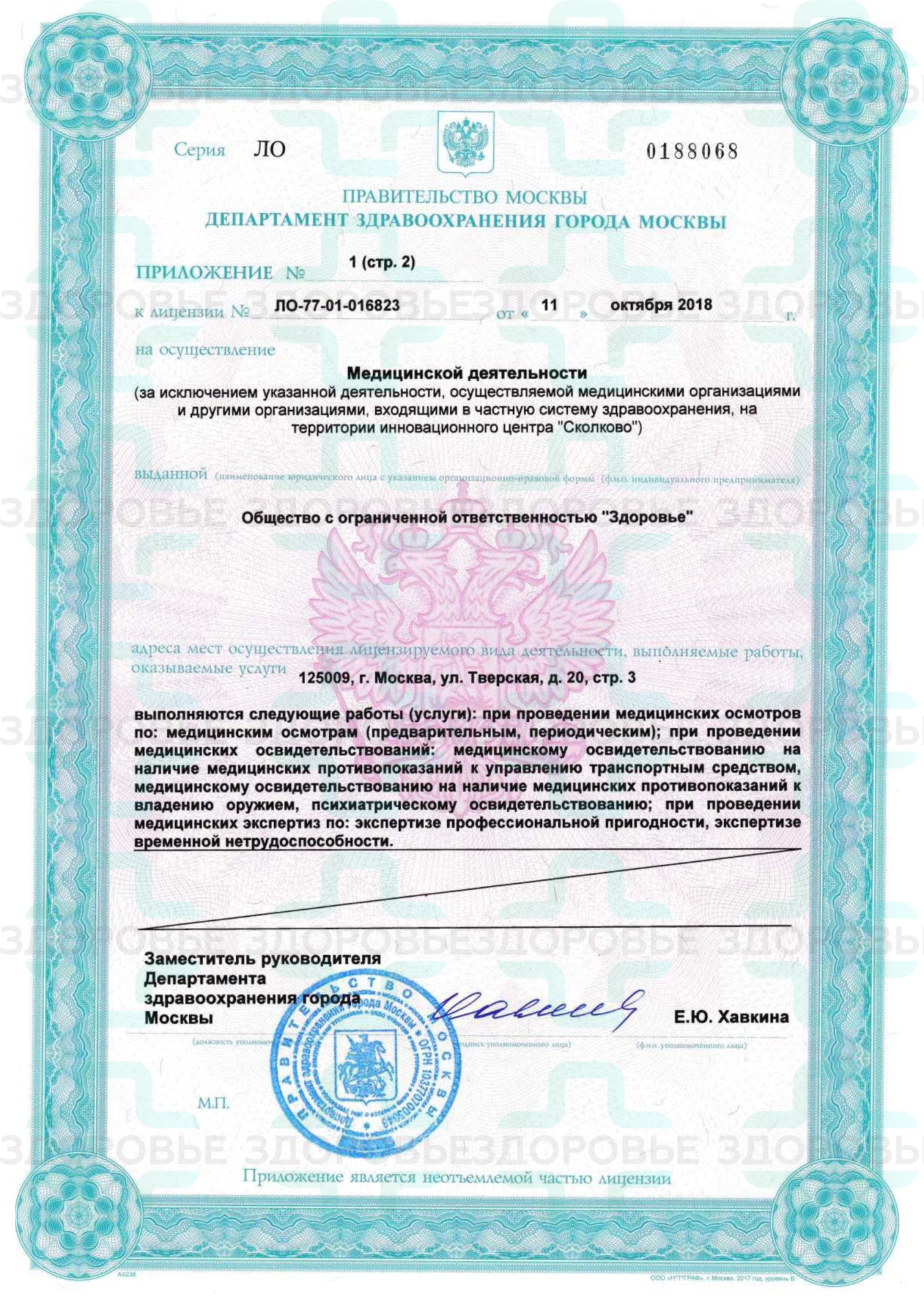 Находясь в поисках медицинского центра, который работает законно, на основании государственной лицензии и оформляет легальные справки, обратите внимание на медцентр «Здоровье». Мы работаем на основании лицензии № ЛО-77-01-016823 от 11.10.2018 года, проверить законность нашей деятельности вы можете на официальном ресурсе сайта Федеральной службы по надзору в сфере здравоохранения www.roszdravnadzor.ru.