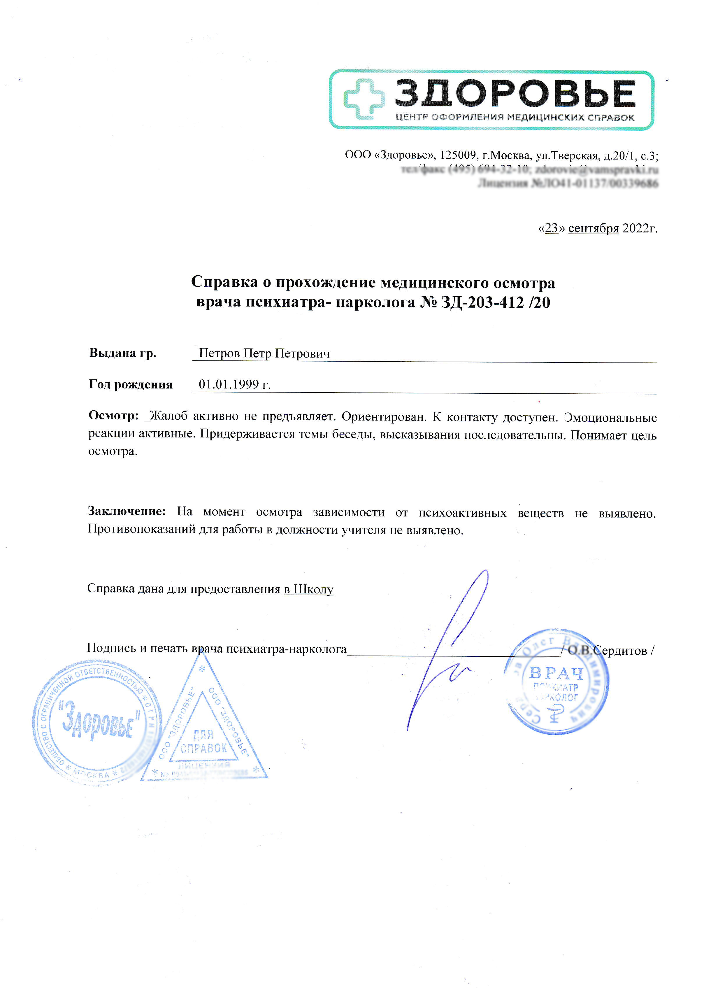 Для получения справки из наркологического диспансера для устройства на работу можно обратиться в государственное учреждение. В поликлинике оформление справки от нарколога стоит также 1650 рублей, при этом вам придется потратить много времени на заказ талонов и сидение в очередях.В медцентре «Здоровье» можно сделать все максимально быстро и легально. Предлагаем записаться на осмотр по телефону, указанному на сайте, или заполнить форму обратной связи. Мы имеем все необходимые разрешения, поэтому официальная справка на бланке установленного образца с печатями и подписями специалистов будет обладать юридической силой в соответствии с законодательством. Вы сможете предъявить документ в различных учреждениях и использовать в любых целях.