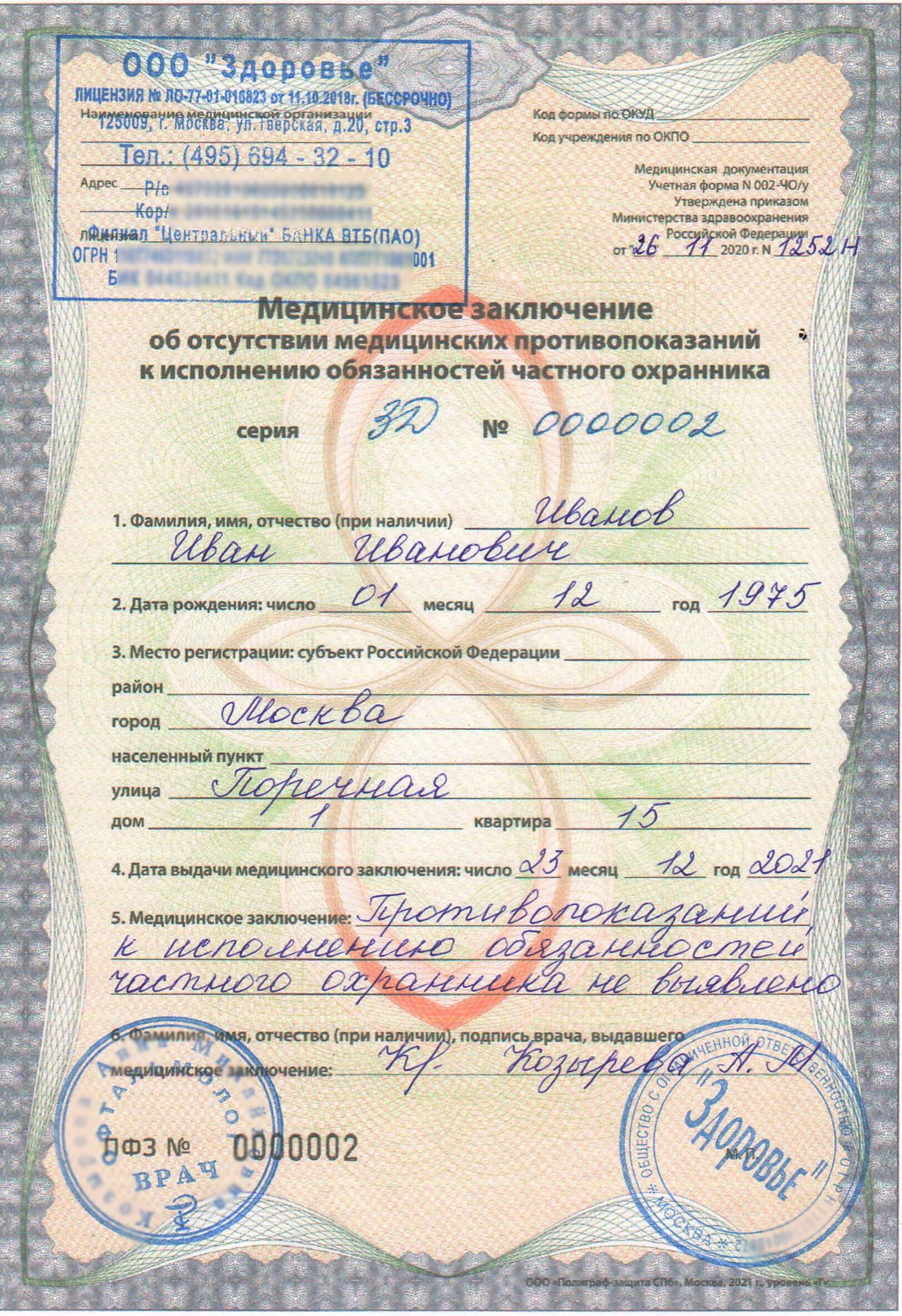 Справка для охранника установленного образца выдается лицензированным медицинским центром с условием, что пациент имеет на руках заключения от психиатра и нарколога.