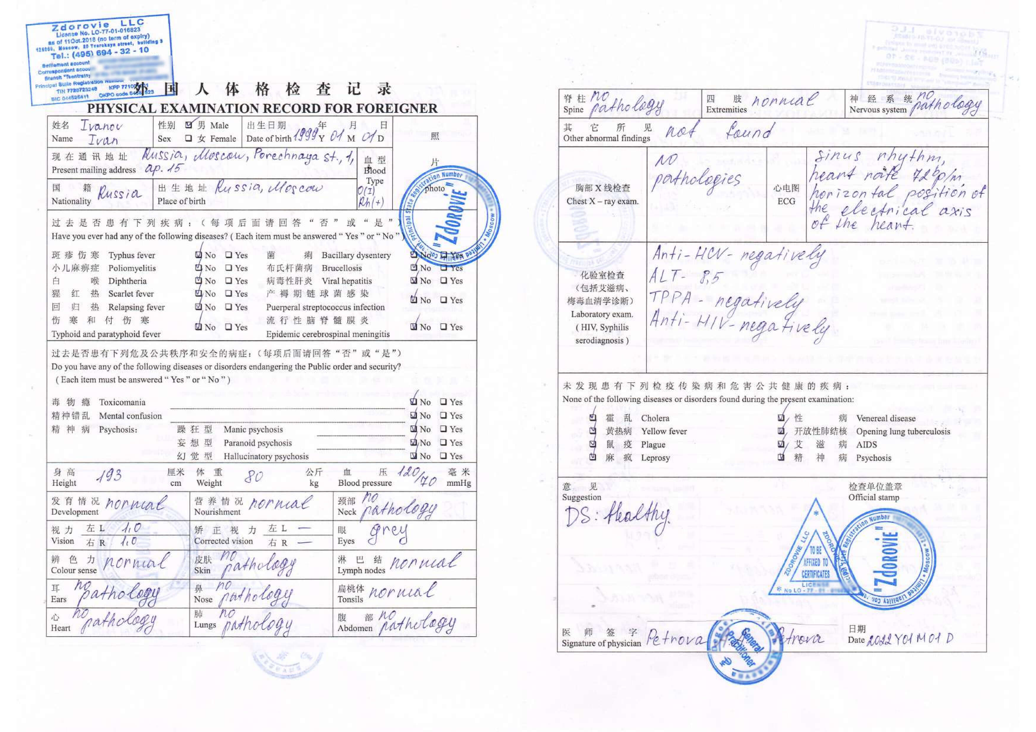 • FOREIGNER PHYSICAL EXAMINATION FORM (Китай)