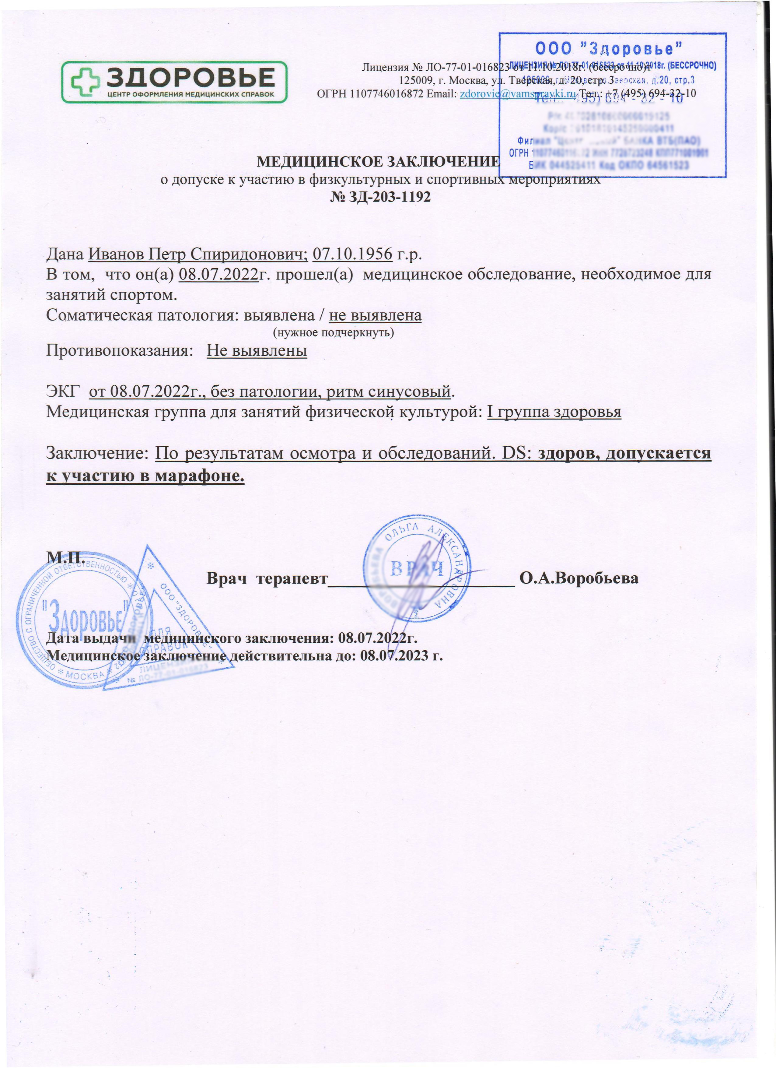 Справка для марафона в Москве в медцентре «Здоровье»
