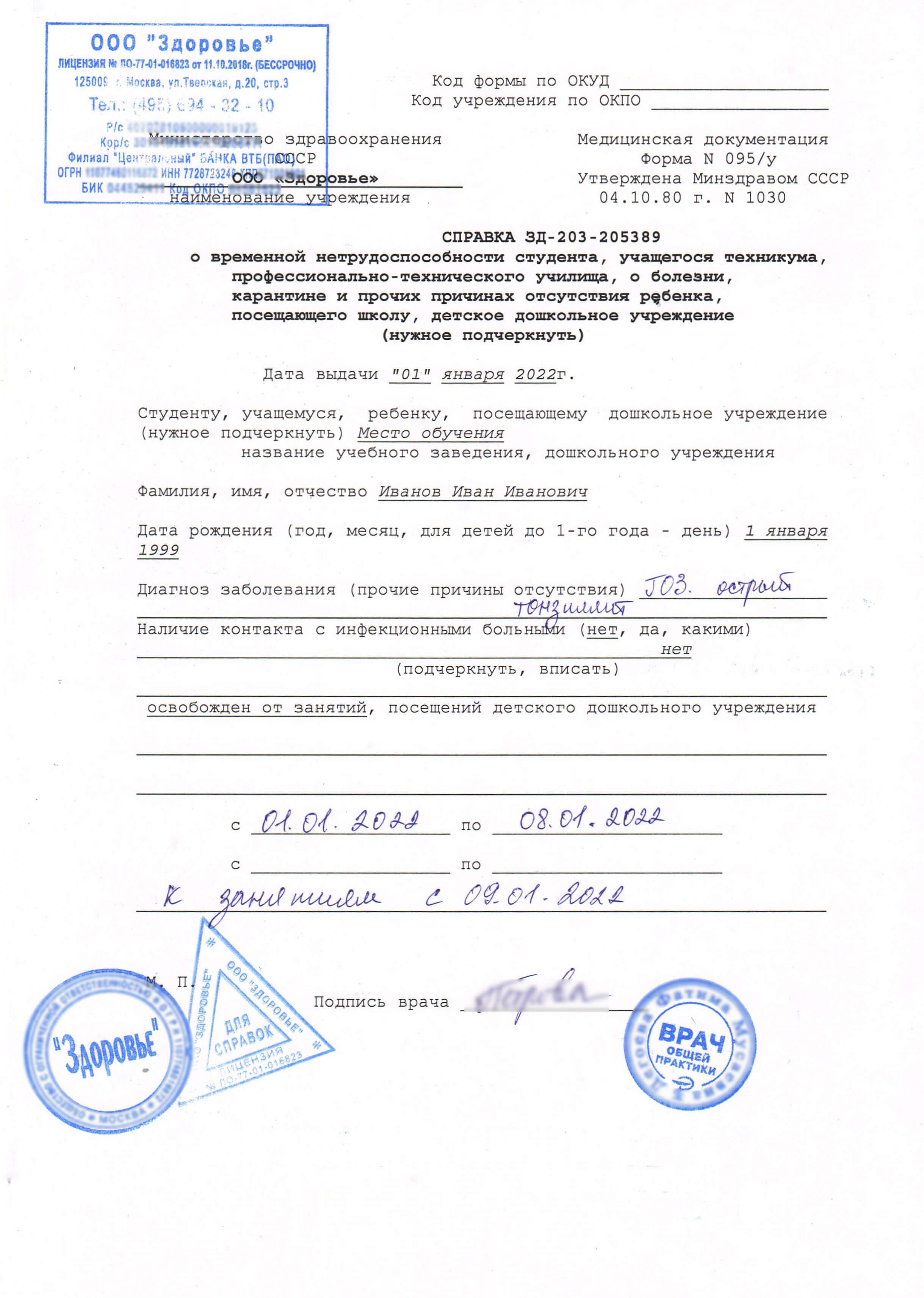 Справка 095-у – медицинский документ, имеющий специальную форму (образец), который подтверждает временную нетрудоспособности студента. Она является официальным подтверждением уважительности пропуска. За пропуск лекций, семинара или зачета студенту поставят прогул, который может негативно отразиться на его среднем балле и послужить причиной для лишения стипендии. Предъявление справки по форме 095-у гарантированно убережет от выставления прогулов. В отличие от листа нетрудоспособности, такой бланк не выдается взрослым. Он предъявляется только по месту учебы. Данную ученическую справку можно получить по болезни:
