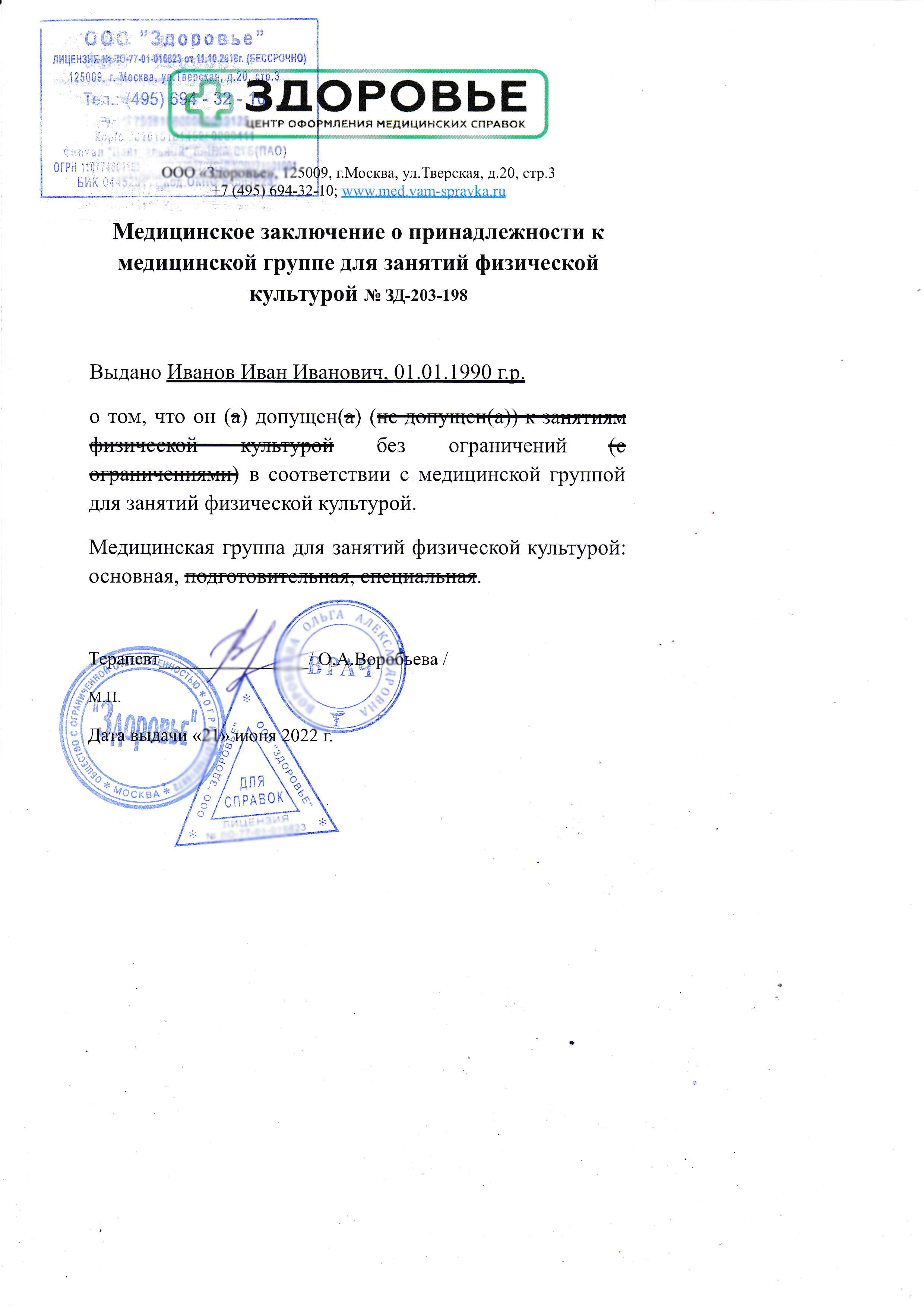 Получить справку о здоровье для физкультуры в Москве быстро и недорого можно в нашем медицинском центре «Здоровье». У нас Вы сможете пройти всех специалистов буквально за 1 час без очередей и оформить справку по низкой цене. Наша клиника имеет все необходимые лицензии и оборудование в рамках государственных стандартов.
