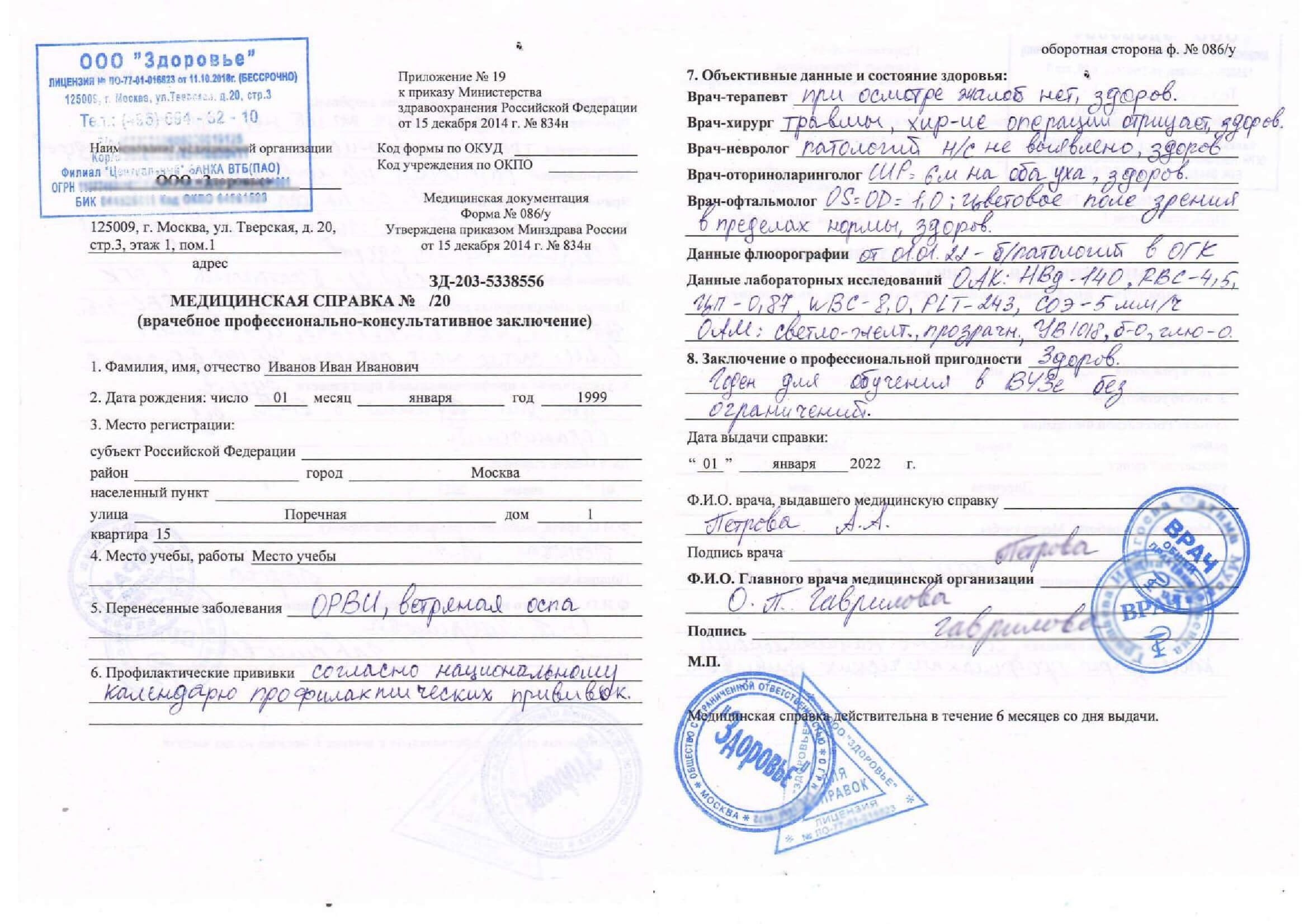 | Медицинская комиссия для справки на работу (ф 086 ) | 2000 | 6 мес |