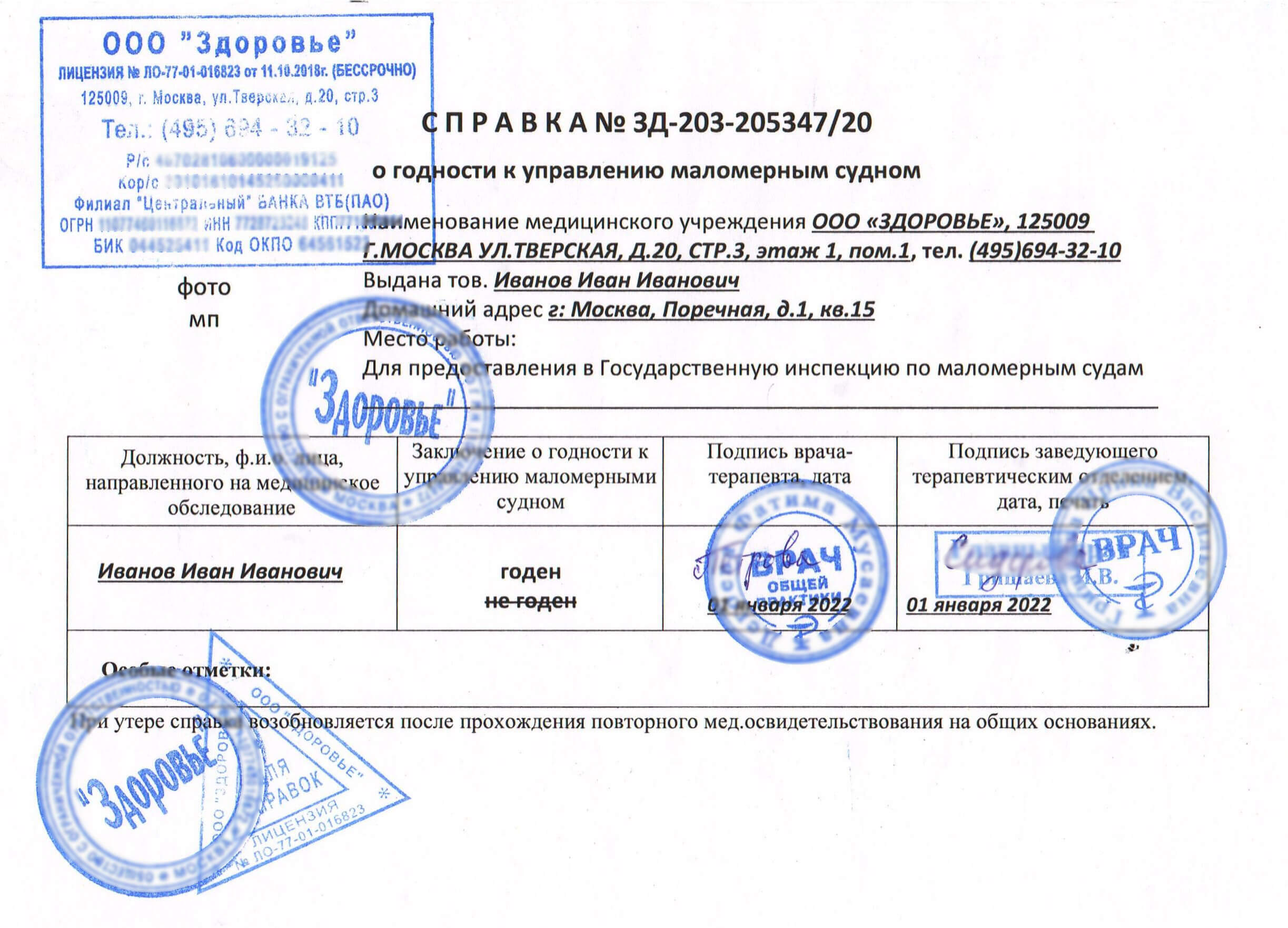 Медосмотр и анализы для оформления справки для управления маломерными судами